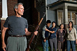| Gran Torino USA 2008 | 116 min | OmU | Regie: Clint Eastwood | Buch: Nick Schenk | Kamera: Tom Stern | Mit: Clint Eastwood, Bee Vang, Ahney Her, Christopher Carley, Brian Haley, Geraldine Hughes, Dreama Walker, Brian Howe, John Carroll Lynch Walt Kowalski hat sein Leben lang in der Autofabrik gearbeitet. Als Rentner fällt ihm nicht viel mehr ein, als ein paar Reparaturen am Haus auszuführen, Bier zu trinken und einmal im Monat zum Frisör zu gehen. Seine früheren Nachbarn sind entweder weggezogen oder gestorben. Jetzt wohnen in seiner Umgebung Migranten des Hmong-Volks aus Südostasien, die er nicht ausstehen kann. Alles, was er um sich herum wahrnimmt, macht ihn wütend: die schiefen Regenrinnen, die verfilzten Rasenflächen und die Ausländergesichter in der Nachbarschaft; das perspektivlose Leben der jugendlichen Hmongs, Latinos und Schwarzen, die das Viertel wie selbstverständlich für sich beanspruchen; seine erwachsenen Kinder, die er als unreif erlebt und die ihm fremd geworden sind. Walt bleibt nichts übrig, als den Rest seines Lebens einfach auszusitzen. Bis jemand eines Nachts seinen 1972er Gran Torino zu klauen versucht. „Man wird den Eindruck nicht los, dass es Eastwood diesmal ernst meint mit seiner allerletzten Rolle - so souverän ist dieser Abgang eines “dirty old man”.“ (Dominik Kamalzadeh, Der Standard) Weitere Infos: wwws.warnerbros.de/grantorino
